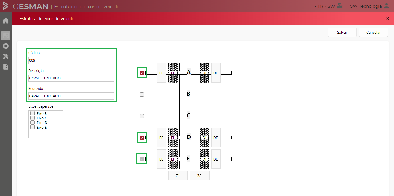 Uma nova tela chamada Estrutura de eixos do veículo irá abrir. Neste momento o usuário deverá cadastrar o Chassi, incluindo o Código, a Descrição, o Reduzido, bem como definir a estrutura de pneus deste Chassi. Para definir a estrutura do Chassi, o usuário deverá marcar quais os eixos deverão ser utilizados na referida TAG (destacado em verde no desenho da estrutura abaixo). Após selecionado o eixo, o sistema abre a opção para escolher os pneus, que podem ser selecionados dando 2 cliques sobre o pneu que deseja ser utilizado. Na imagem abaixo temos o exemplo de um Chassi de um Veículo Trucado.
