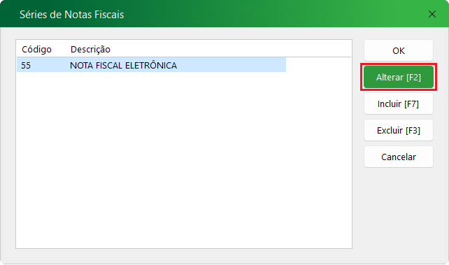 2. Ao acessar tela, é necessário verificar no cadastro de Séries Fiscais as séries utilizadas para emissão de notas fiscais e selecionar a opção alterar. No caso do exemplo, utiliza-se a série nº 55.