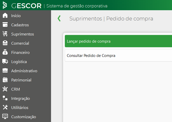Para incluir o pedido de compras no GESCOR basta selecionar o menu “Suprimentos”, ir na opção ” Pedido de Compra” e então “Lançar Pedido de Compra”.
