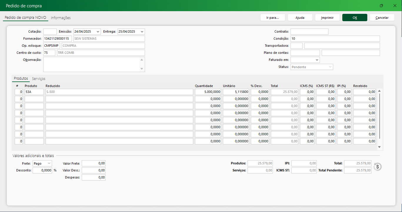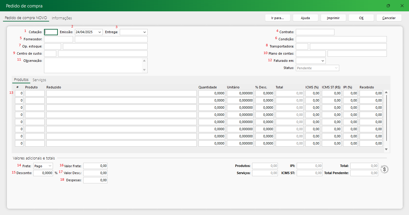 12. Faturado em: Campo não obrigatório. Tem a finalidade de provisionar o valor do pedido de compra no fluxo de caixa para pagamento.