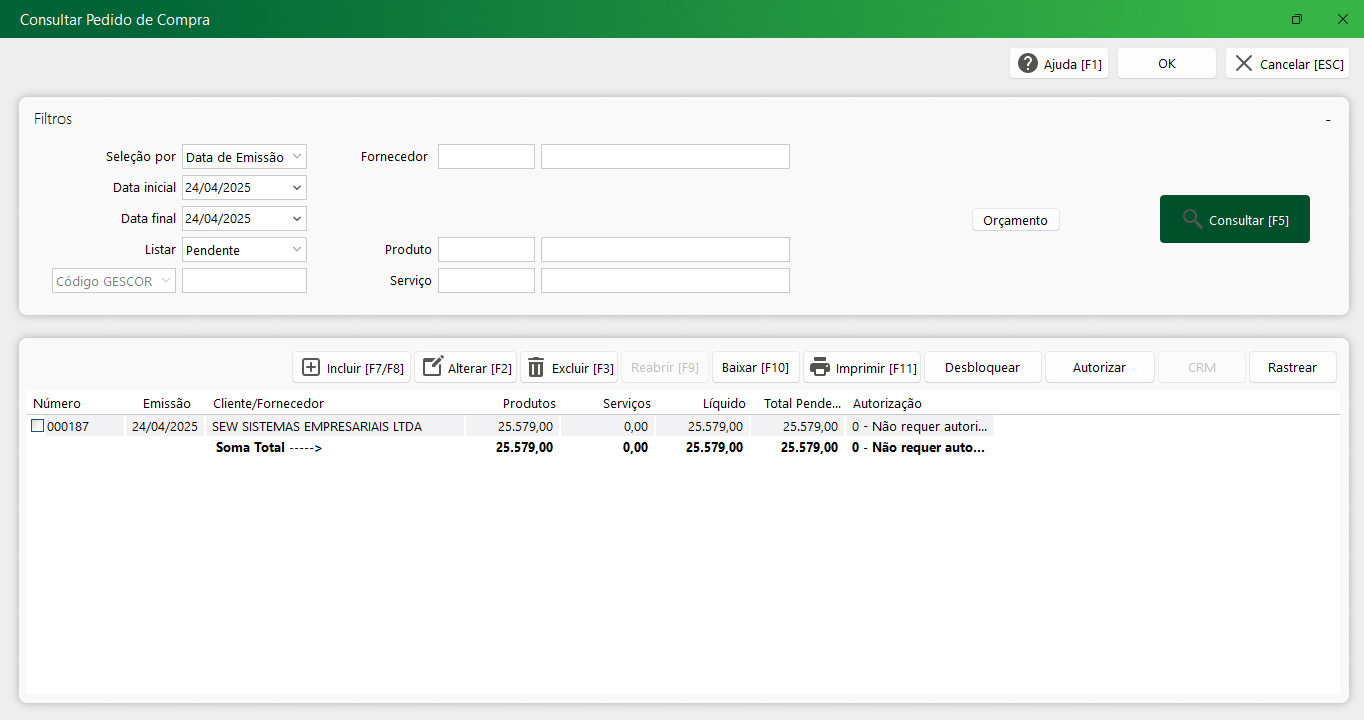 O pedido de compra poderá ser visualizado na pagina de nome “Consultar Pedido de compra”.