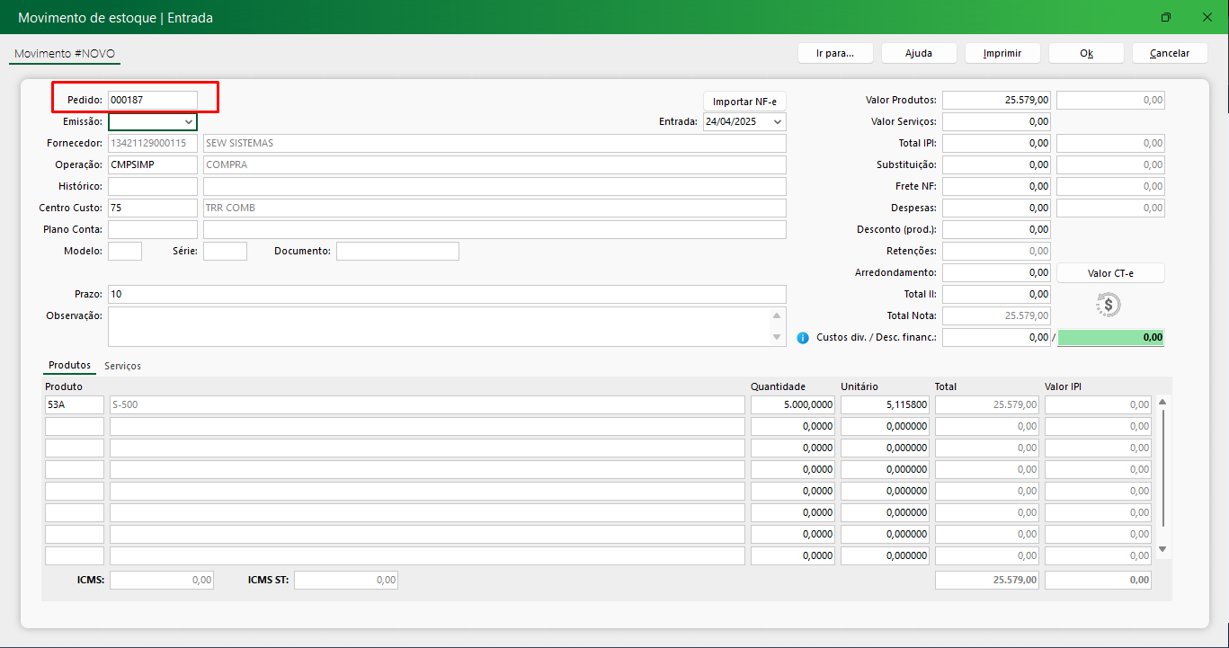 Este mesmo pedido poderá ser utilizado no momento de lançar entrada da nota fiscal de compra, bastando inserir o número do pedido no respectivo campo. (Para lançar entrada, podemos acessar o manual clicando aqui).