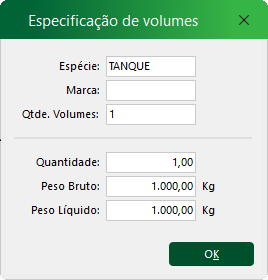 Com a movimentação finalizada, basta clicar em “Fechar” . Novamente na tela de emissão de NF-e, seleciona-se a opção “OK”. Preenche-se então a especificação de volumes e posteriormente seleciona-se “Ok”.