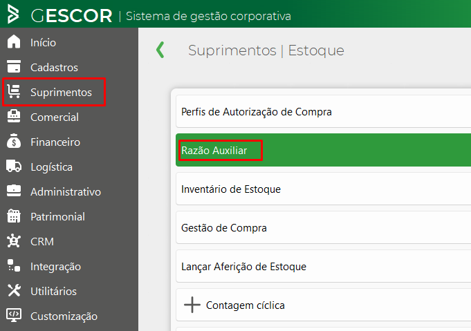 A tela de razão auxiliar pode ser encontrada no menu suprimentos pelo seguinte caminho: