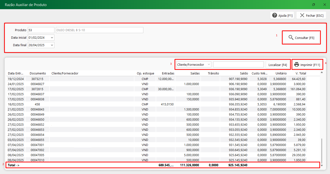 - Estes são o principais campos de filtro da consulta da tela. Neles será necessário informar o produto e data inicial e data final de filtro. Com estas informações preenchidas, basta selecionar a opção consultar.