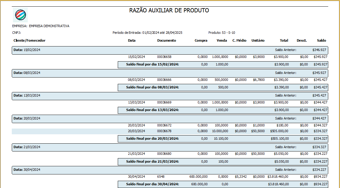 A ferramenta de razão auxiliar foi concebida para auxiliar na visualização das entradas, saídas e saldos dos estoques de produtos. A partir dela é possível pesquisar um produto dentro de um determinado período e analisar suas movimentações e comportamentos.