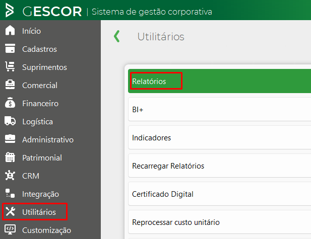Ao carregar a biblioteca de relatórios, surgirá uma nova tela. Nesta é necessário selecionar a opção comercial e posteriormente o relatório de “Relação de Lucratividade por cliente e Bens Patrimoniais alocados”.