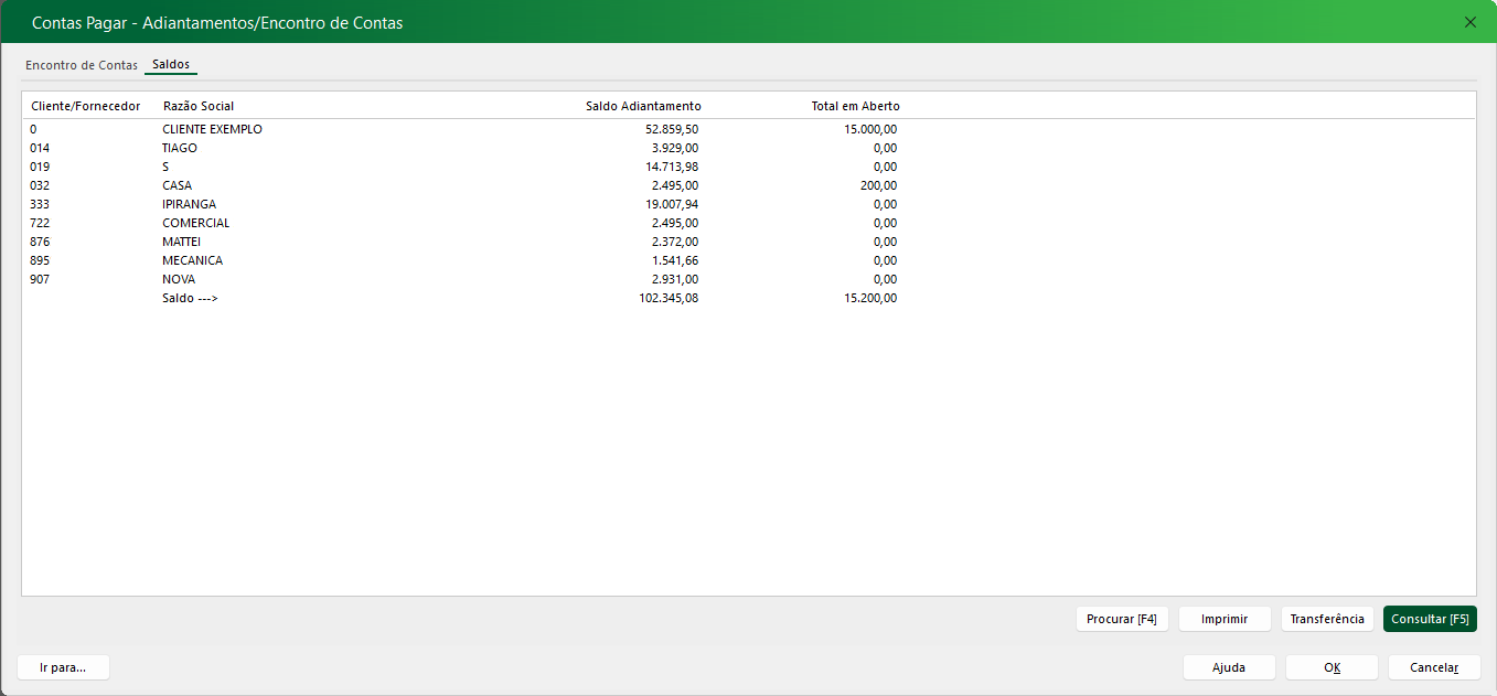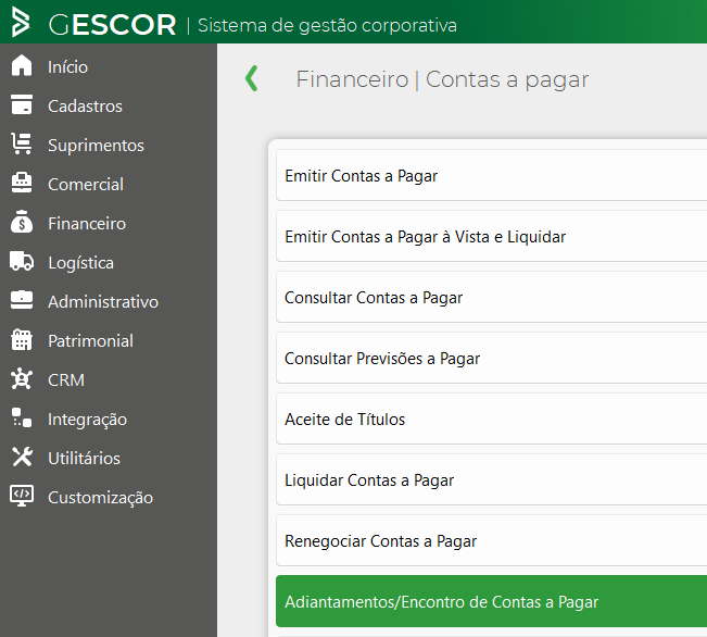 A ferramenta de adiantamentos/encontro de contas foi desenvolvida para facilitar o abatimento de valores com compras. A partir dela é possível gerenciar os saldos de valor em carteira adiantados para fornecedores e deduzi-lo com notas fiscais de compra.