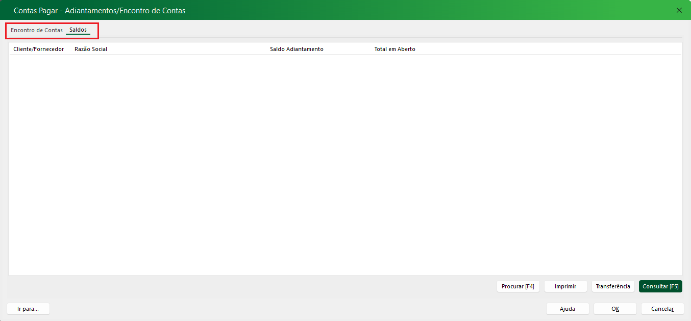 2. Ao selecionar o menu de adiantamentos será aberta uma nova tela. Esta terá as opções de “Saldos” e “Encontro de Contas”.