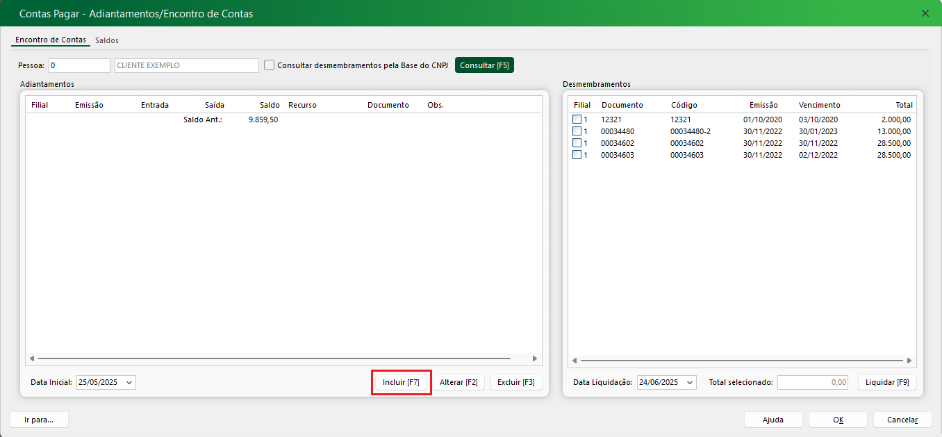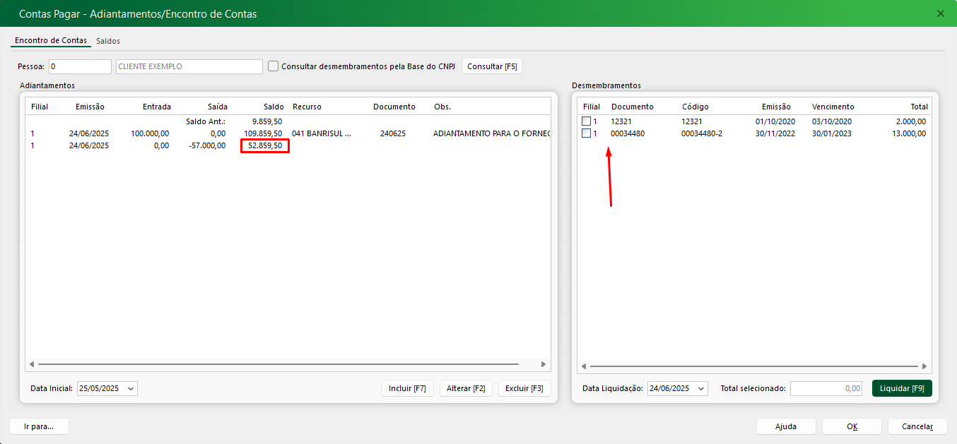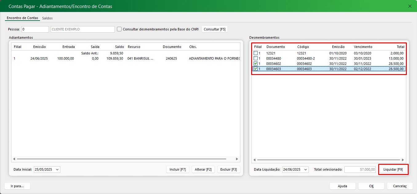 5. Com os valores atualizados, basta selecionar as contas que irão consumir o saldo respectivo ao adiantamento e selecionar a opção “Liquidar” para efetivar o procedimento.