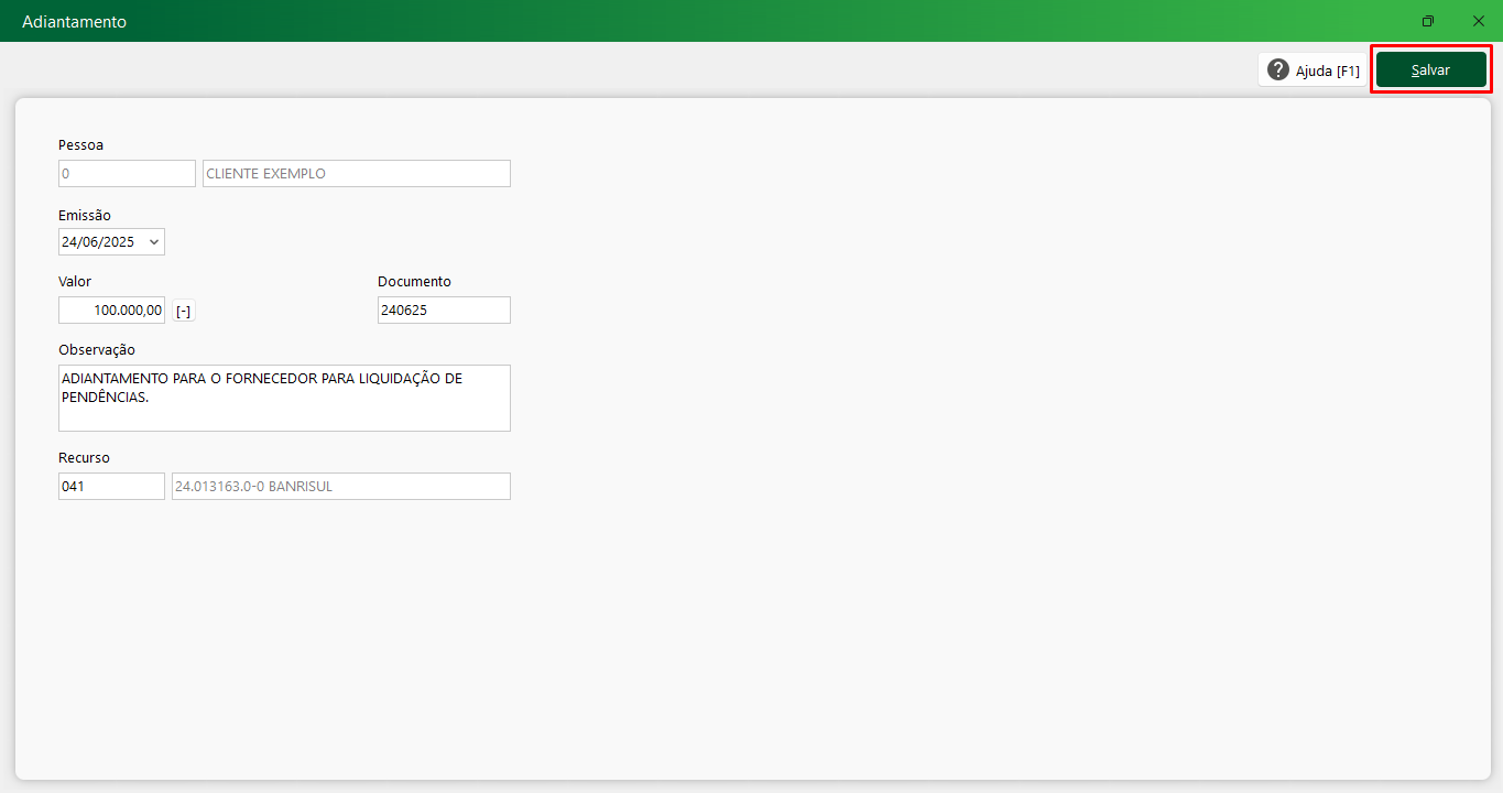 3. Para lançar um adiantamento basta informar a pessoa, e selecionar o botão “Incluir”.