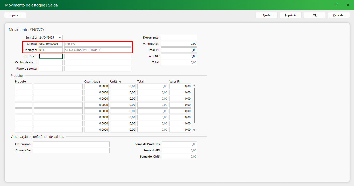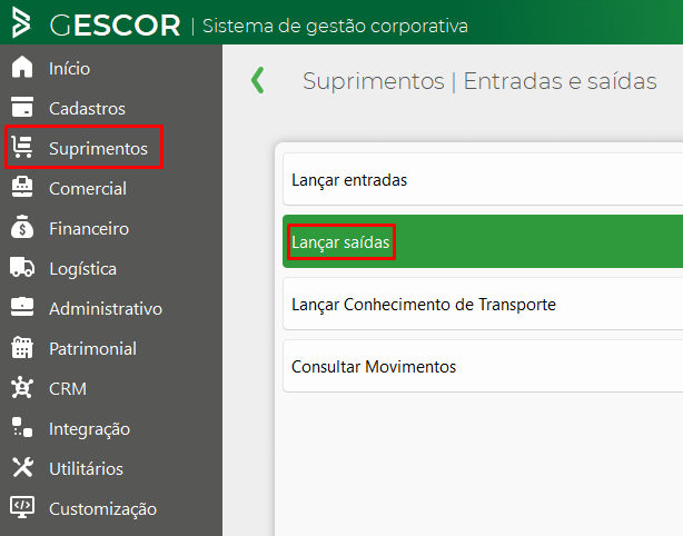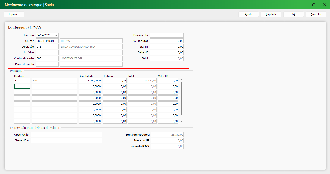 Selecionando a opção lançar saídas surgirá uma tela de movimentos de saída.