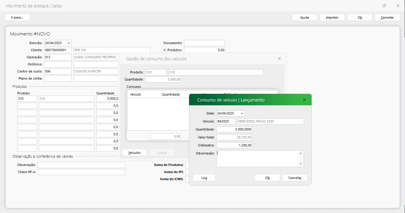 Após o lançamento de cada item será solicitado a vinculação de placa para indicar em qual veículo o produto foi utilizado e a quilometragem deste do mesmo.