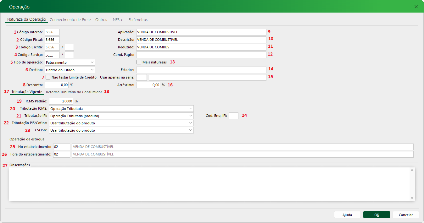 25. Operação de Estoque – No estabelecimento: Operação de estoque associada a CFOP caso a mesma movimente estoques (para cadastro de operações de estoque temos um manual aqui)