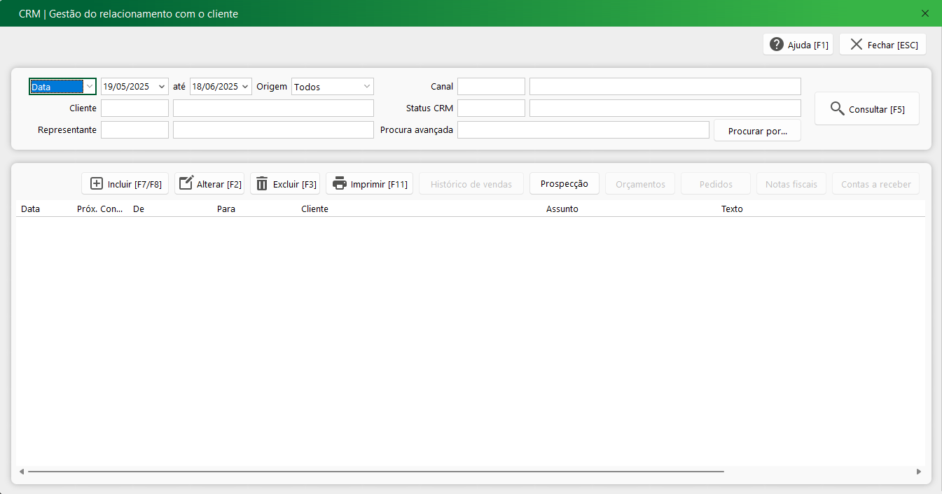 Independente de ambas as formas de abertura do CRM, será aberta a tela abaixo:
