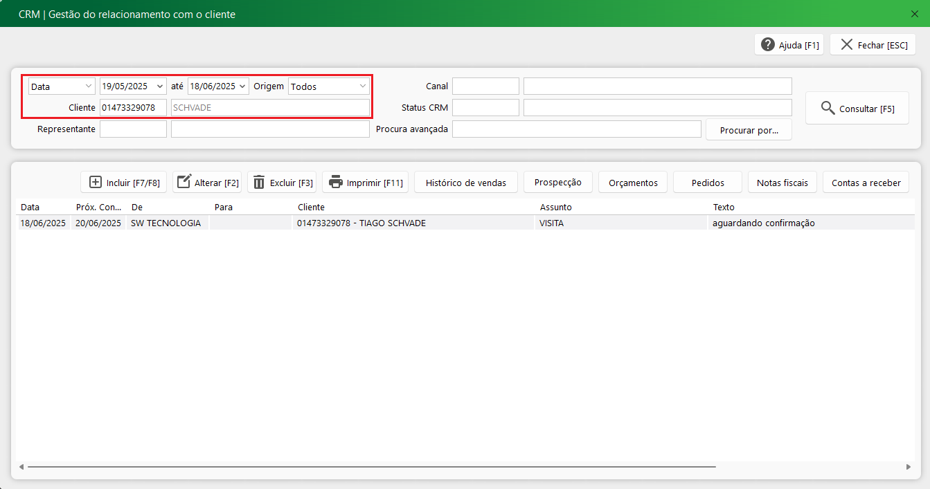 Esta é a principal tela do módulo de CRM, pois é nela que ficarão registradas todas as ocorrências, acontecimentos, visitas de cada cliente.
