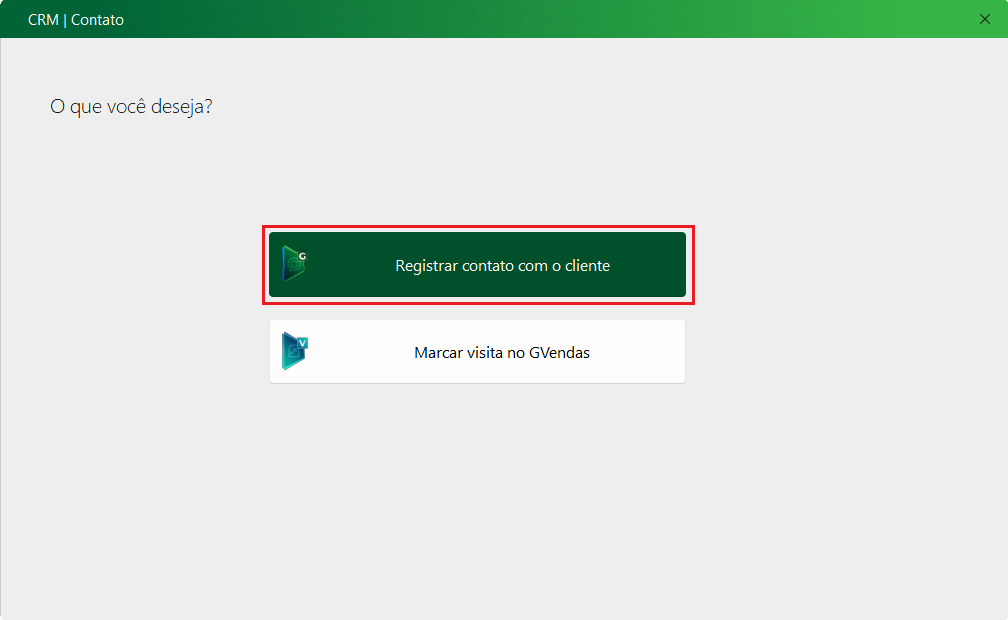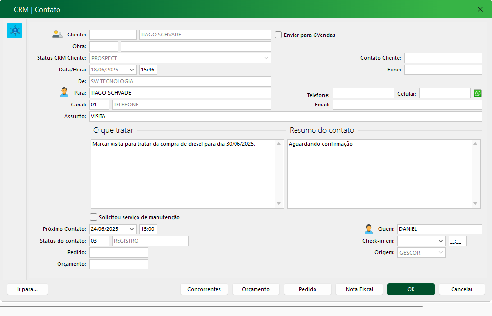 Selecione a opção Registrar contato com o cliente e a tela abaixo será aberta: