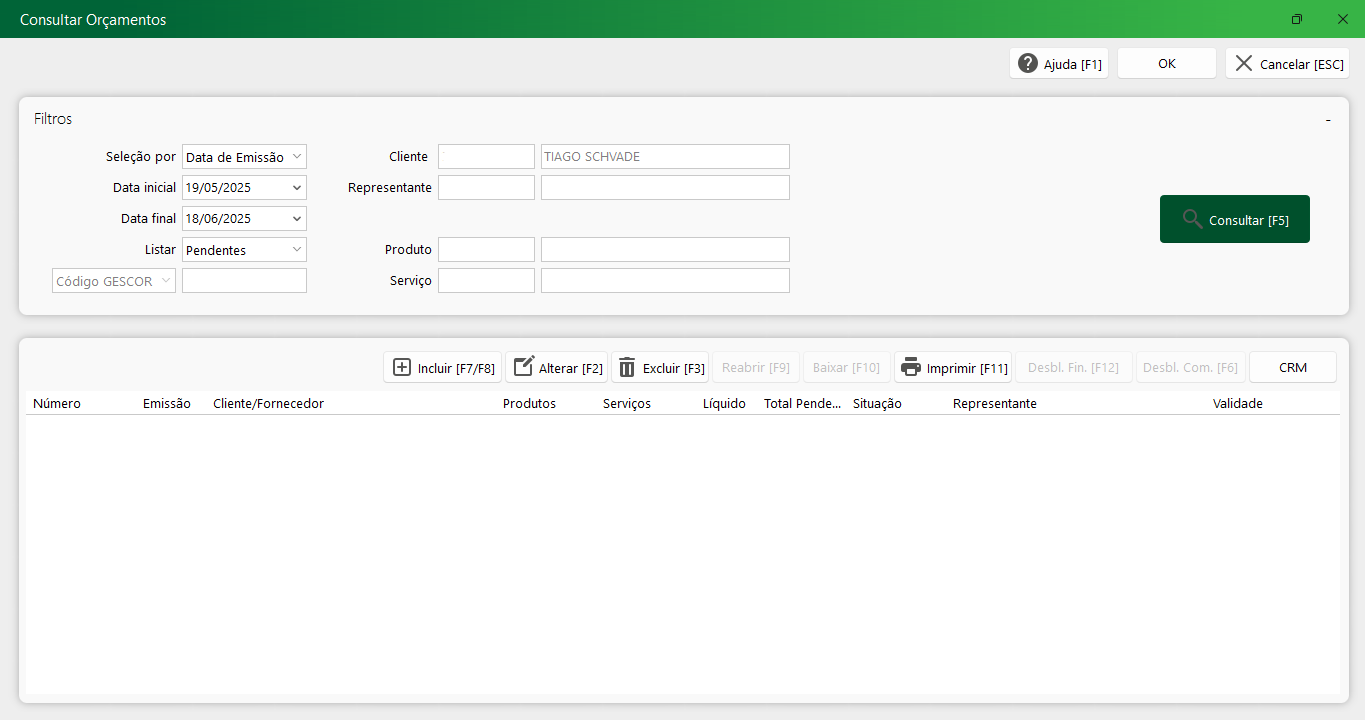 Botão Orçamentos: Este botão apresentará uma tela com os orçamentos fornecidos para o seu cliente.