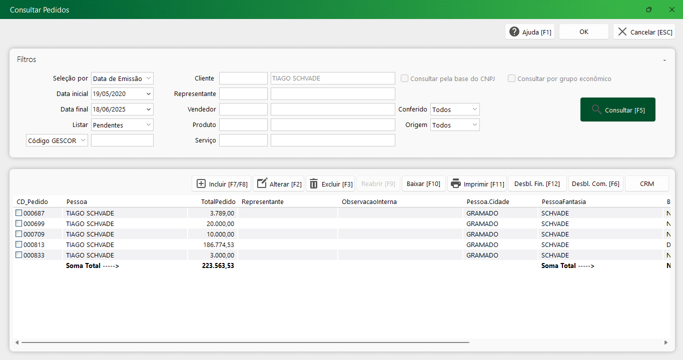 A partir dela além de verificar o histórico de ações comerciais tomados com cada cliente, pode-se incluir pedidos, emitir notas fiscais, gerar orçamentos, verificar o histórico de compras do cliente e as pendências financeiras.