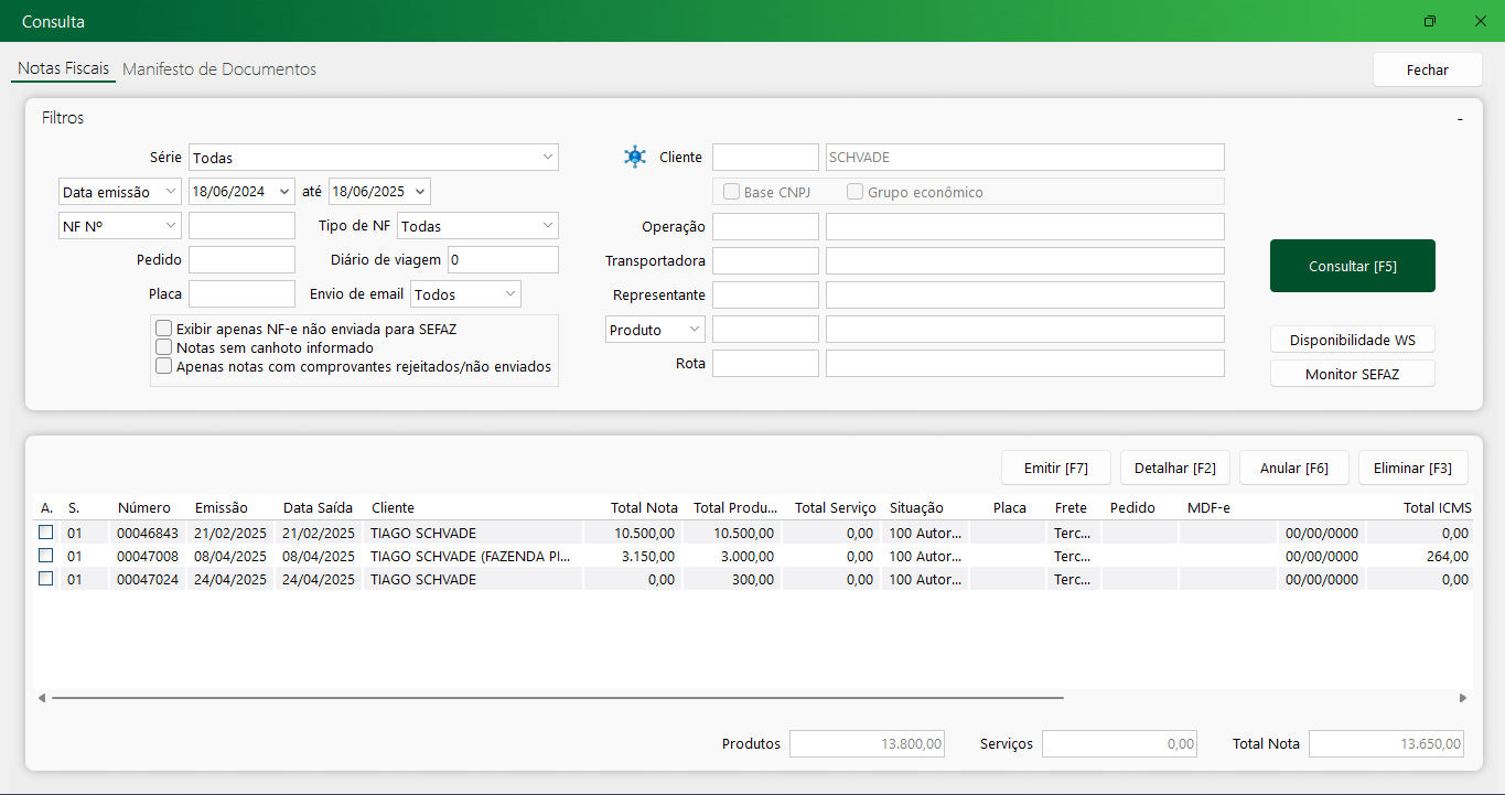 Botão Notas Fiscais: Este botão tem a função de listar todos as notas fiscais emitidas para o cliente dentro do período consultado.
