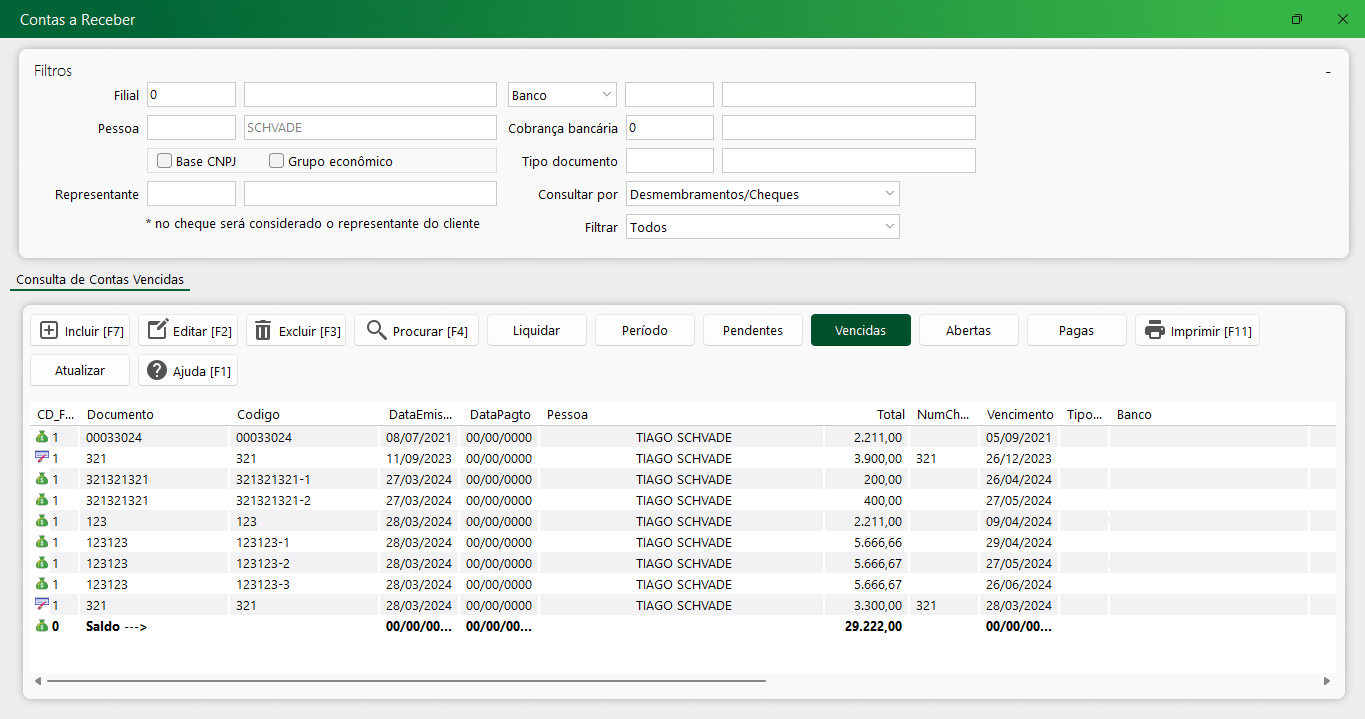 Botão Contas a Receber: Este botão tem a finalidade de listar todas as contas a receber do cliente tratado. Ele abrirá a tela do Financeiro Recebimentos/Contas a Receber.