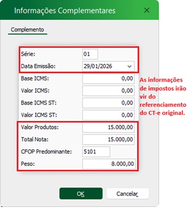 Já na tela em questão, devemos preencher os campos de ‘chave NF-e’. Nsequência irá aparecer uma tela para inserir mais informações complementares, que também devem ser preenchido o máximo que conseguir, mas ICMS e outros impostos não tem necessidade, pois será referenciado outro CT-e. Segue imagem do campo complementar citado: