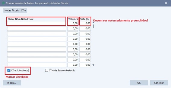 Na sequência preenchemos volume (quantidade na nota) e Frete% (Por exemplo, 0,14 centavos ou porcentagem direta, essa informação é obrigatória), e marcar o checkbox ‘CT-e Substituto’. Segue print da tela mencionada: