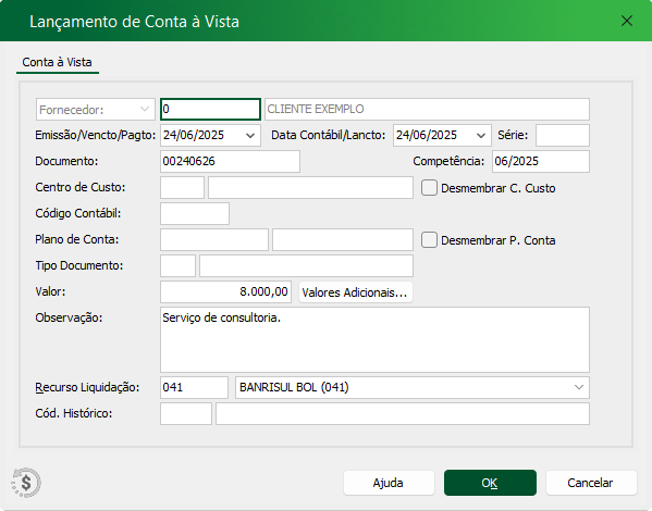 Ao selecionar a opção indicada acima, será aberto uma tela de lançamentos. Nesta tela basta relacionar o cliente/beneficiário (quem está recebendo), e os respectivos dados da conta paga a vista.