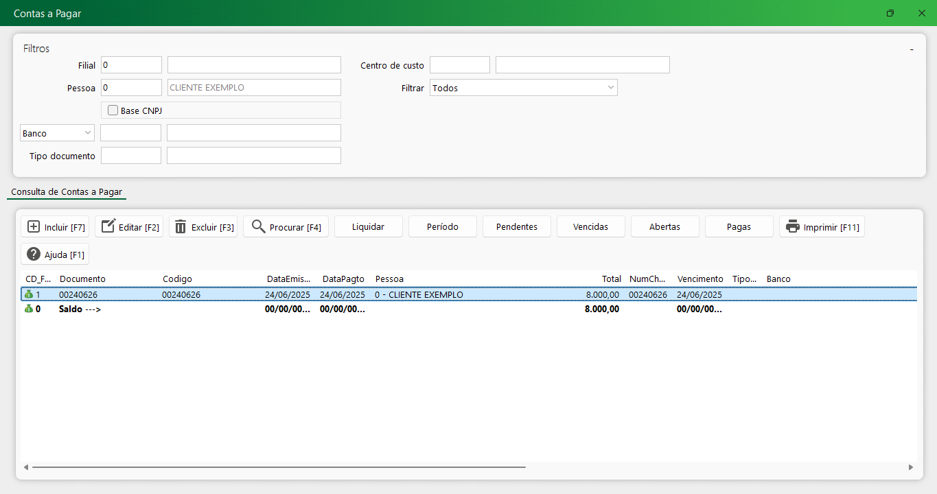 A conta estará criada e visível na tela de contas a pagar na opção “pagas” ao pesquisar pela pessoa.