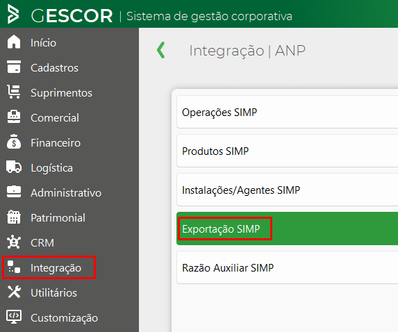 Integração -> ANP -> Exportação SIMP (vide a imagem abaixo)