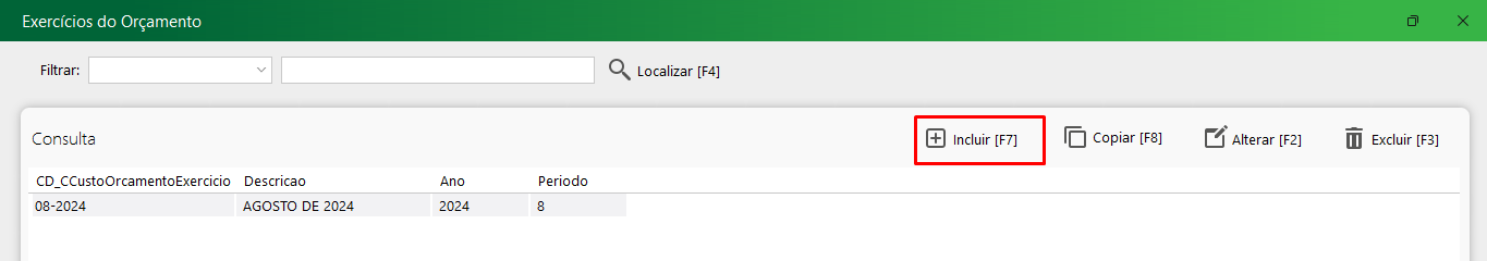 2. Será aberto uma tela de consulta. Caso não exista nenhum orçamento cadastrado, a mesma estará em branco, tal como a da imagem abaixo. Para iniciar o procedimento de cadastro, basta selecionar o botão “Incluir”.