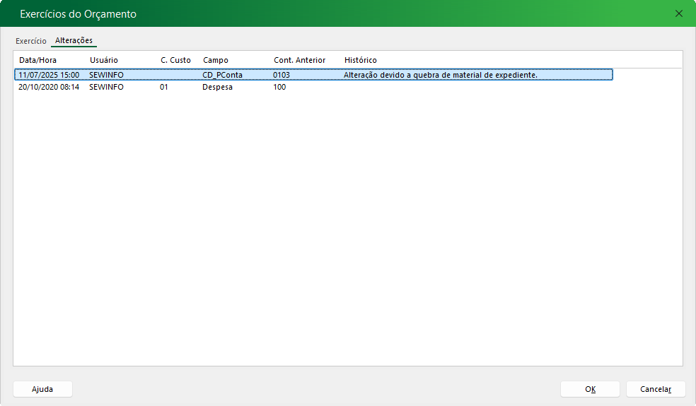 7. Todas as alterações poderão ser visualizadas no campo respectivo à alterações.