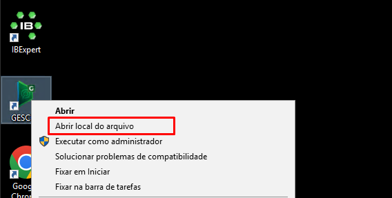 - O primeiro passo é acessar a tela inicial do seu Windows e clicar com o botão direito sobre o ícone do GESCOR e selecionar a opção abrir local do arquivo.
