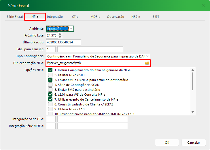 3. Ao selecionar a opção alterar será aberto uma nova tela na qual é necessário acessar a aba nota fiscal. Dentro desta aba é necessário verificar o local onde são depositados os arquivos após a geração dos mesmos.