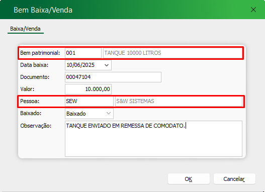 Ao finalizar o cadastro do item que será enviado em comodato, automaticamente será aberta uma pequena tela solicitando o registro da movimentação no banco de dados do sistema, nesta deve-se selecionar a opção “OK”.