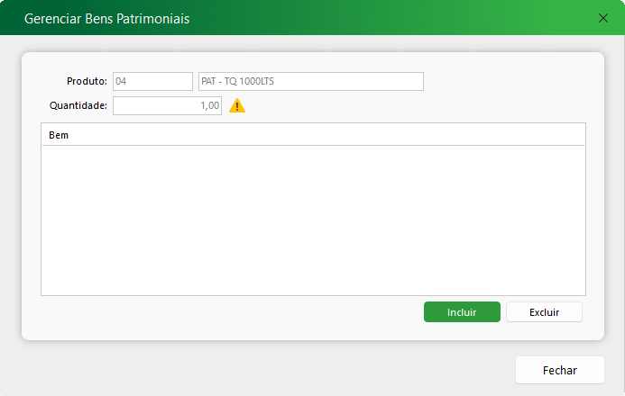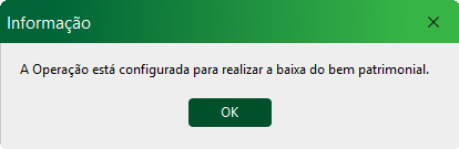 3- Ao terminar de digitar a informação do produto na nota fiscal será aberta uma tela informando que a operação está configurada baixar/vender um bem patrimonial.
