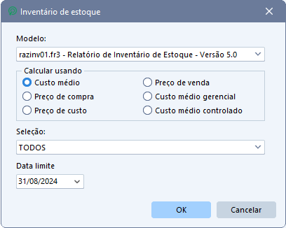 - Modelo: Aqui o usuário escolhe qual modelo de relatório será gerado. Neste caso, o modelo selecionado é “Relatório de Inventário de Estoque – Versão 5.0”.