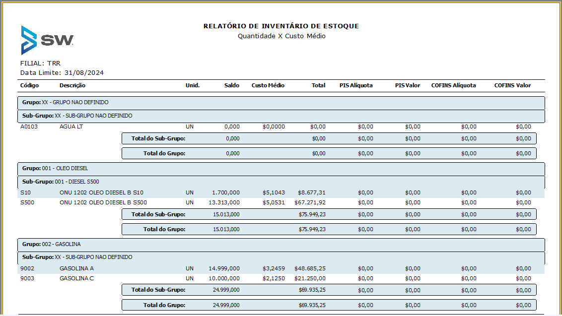 - Total do Sub-Grupo/Total do Grupo: Há totais calculados tanto por Subgrupo quanto por Grupo. Por exemplo, no grupo “ÓLEO DIESEL”, o total do subgrupo “DIESEL S500” foi de 13.313,000 unidades, totalizando $67.271,92. Além disso, o total para cada grupo é exibido, permitindo um resumo consolidado para fácil interpretação.