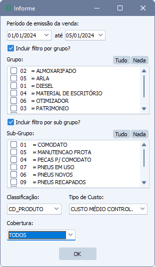 Sub-Grupo: permite filtrar por sub-grupos de produtos específicos, ou todos, caso deixe o filtro em branco.
