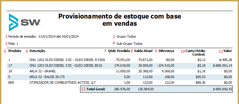 - Filial: indica a filial selecionada no filtro inicial. O relatório só irá considerar vendas e saldo da filial selecionada.